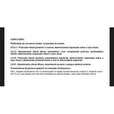 Bom dia, Dr. Poderia explicar o resultado dessa ressonância da coluna? A consulta vai demorar muito, infelizmente. Sinto muita dor na região glútea e perna.