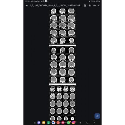 Não encontrei nada anormal nessas imagens de tomografia do crânio, aliás muito bem feitas. Mas não devemos esquecer que analisar imagens de tomografias de crânio transmitidas através de câmaras de celulares, que têm baixa resolução, é algo imprudente. O mais prudente será você levar esse exame para análise do médico que solicitou o procedimento.
