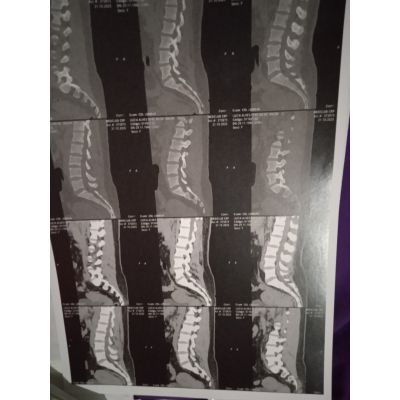 Esse é um exame de Tomografia computadorizada da coluna lombo-sacra, com reconstrução em plano sagital. A tomografia é um exame excelente para diagnostico de doenças ósseas e articulares da coluna vertebral, mas é muito limitado no diagnostico da hérnia distal. O exame perfeito para diagnóstico da hérnia discal é a Ressonancia magnética da coluna lombo-sacra.