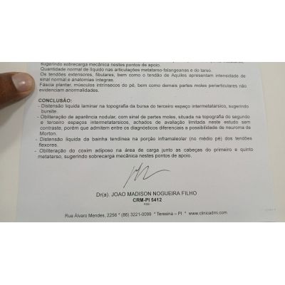 Existem várias sugestões diagnosticas na descrição dos achados de sua ressonância magnética do pé. Agora você deverá levar esse resultado e os filmes do exame, para analise do ortopedista que o solicitou.